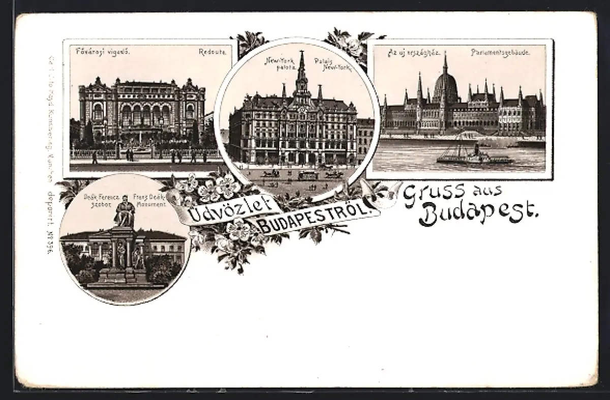 Lithographie Budapest, Parlamentsgebaude, Palais New York, Redoute, Franz Déak Monument