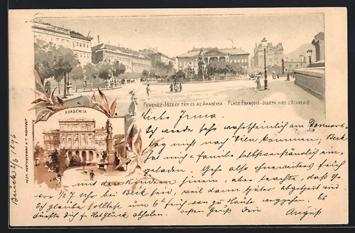 Lithographie Budapest, Place Francois-Joseph avec l`Academie, Akademia