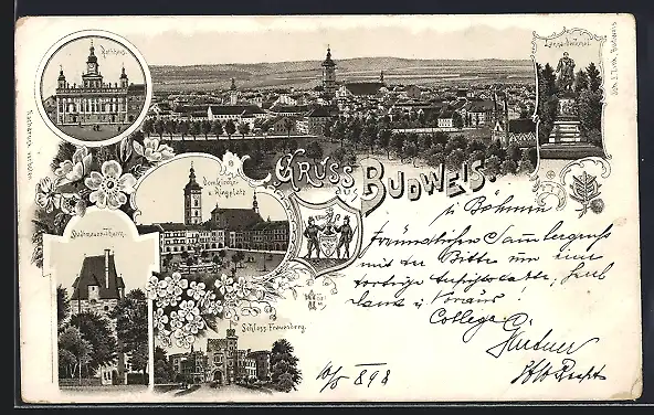 Lithographie Budweis / Ceske Budejovice, Rathhaus, Lanna-Denkmal, Domkirche und Ringplatz, Schloss Frauenberg