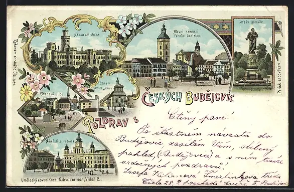 Lithographie Budweis, Vídenska ulice, Chrám svate Anny, Lanouv pomník