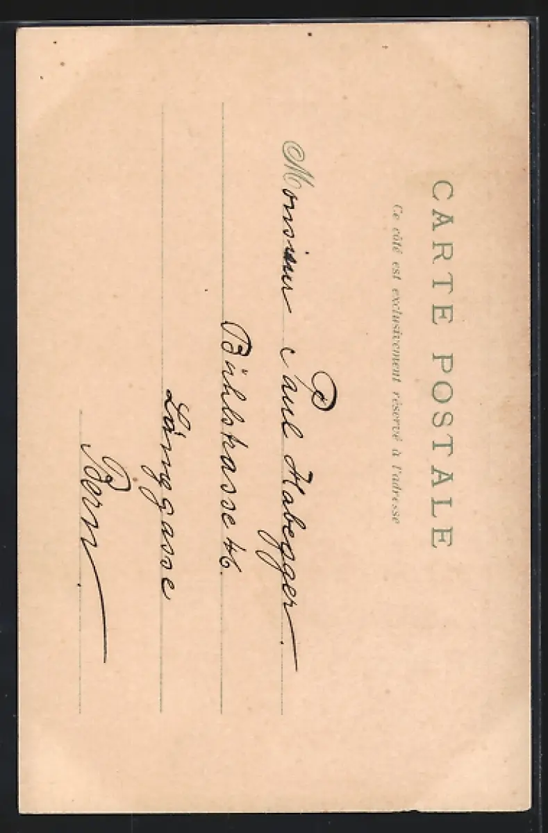 Personenbezogene Daten auf der Rückseite der Karte wurden durch blauen Textmarker unkenntlich gemacht. Die blauen Stellen sind auf die Vorderseite durchgeweicht und wirken sich negativ auf das Postkartenfoto aus