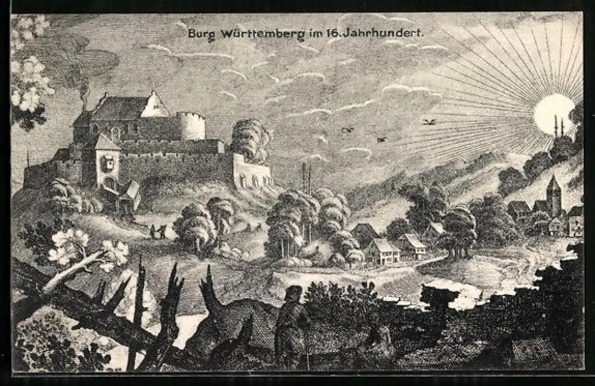 Lithographie Burg Württemberg, Aussenansicht der Burg mit umgebendem Ort und Sonne