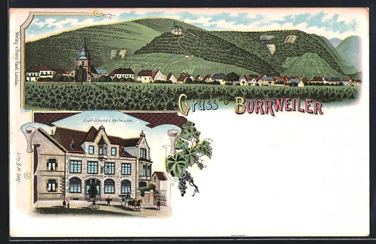 Lithographie Burrweiler, Gasthaus zur Krone v. Hellmann, Totalansicht
