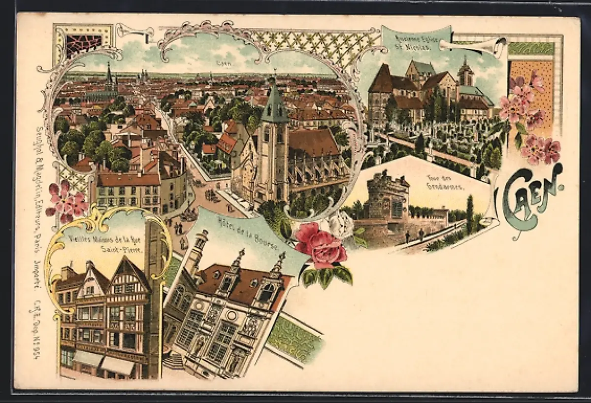 Lithographie Caen, Hôtel de la Bourse, Tour des Gendarmes, Ancienne Eglise St. Nicolas