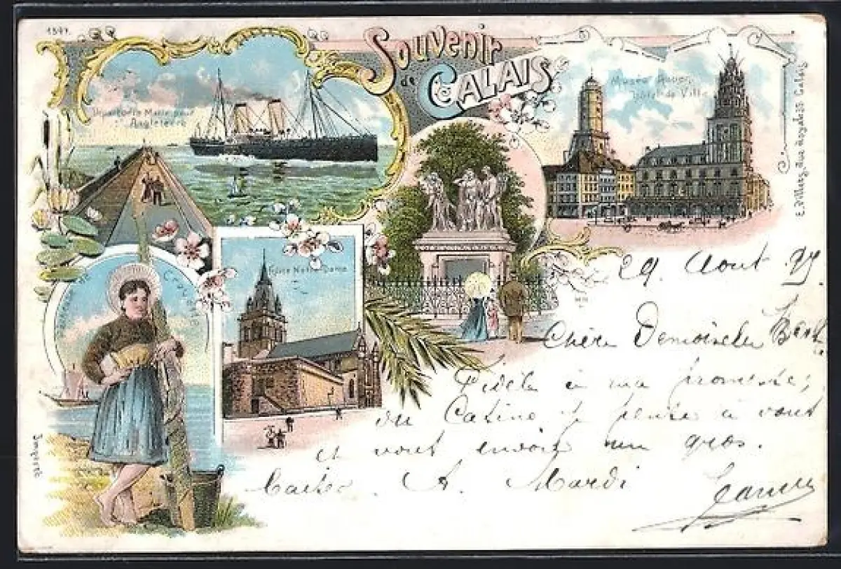 Lithographie Calais, Départ du vapeur pour l`Angleterre, Pécheuse de Crevette, Eglise Notre-Dame, Musée Ancien