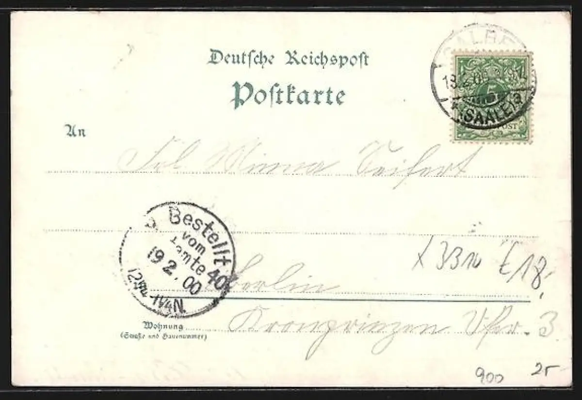 Personenbezogene Daten auf der Rückseite der Karte wurden durch blauen Textmarker unkenntlich gemacht. Die blauen Stellen sind auf die Vorderseite durchgeweicht und wirken sich negativ auf das Postkartenfoto aus