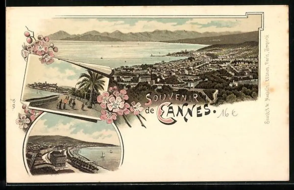 Lithographie Cannes, Vue panoramique et scènes côtières