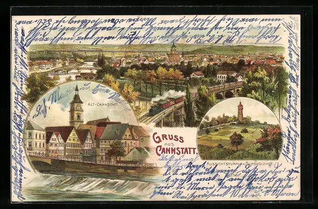 Lithographie Cannstatt, Ortsansicht mit Dampfzug, Aussichtsturm a. d. Burgholzhof