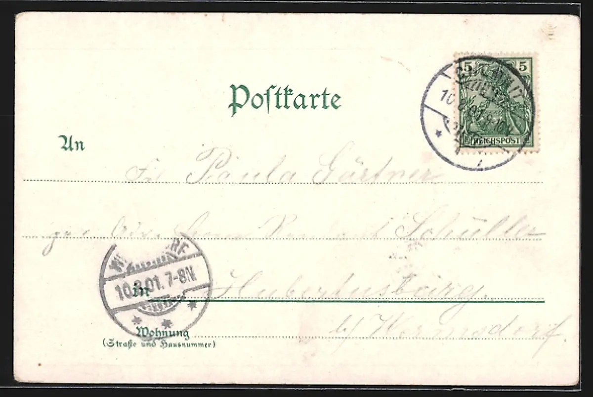Personenbezogene Daten auf der Rückseite der Karte wurden durch blauen Textmarker unkenntlich gemacht. Die blauen Stellen sind auf die Vorderseite durchgeweicht und wirken sich negativ auf das Postkartenfoto aus