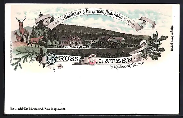 Lithographie Clatzen b. Marienbad, Gasthaus z. balzenden Auerhahn