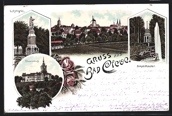 Lithographie Cleve, Schwanenburg, Lohengrin-Denkmal, Amphitheater