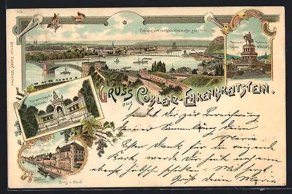 Lithographie Coblenz-Ehrenbreitstein, Kaiserin Augusta-Denkmal, Burg und Mosel, Kaiser Wilhelm-Denkmal