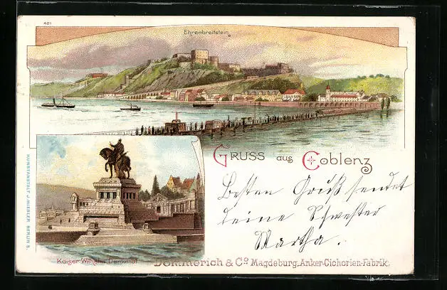 Lithographie Coblenz, Ehrenbreitstein hinter Stadtpanorama, Kaiser Wilhelm-Denkmal