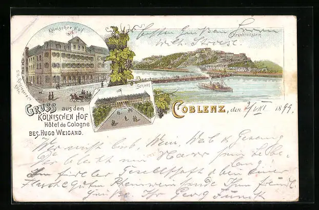Lithographie Coblenz, Hotel Kölnischer Hof, Ehrenbreitstein mit Dampfer