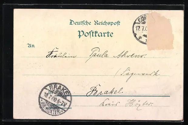 gelaufen 1900, Briefmarke entfernt, rückseitig Oberflächenschaden, guter Zustand