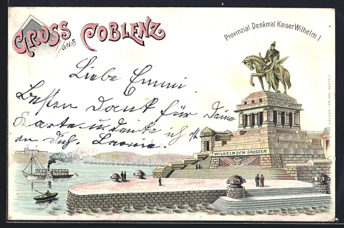 Lithographie Coblenz, Provinzial Denkmal Kaiser Wilhelm I., Ansicht vom Wasser