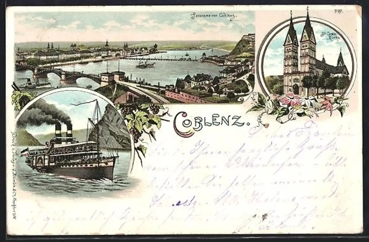 Lithographie Coblenz, St. Castor Kirche, Dampfer auf dem Rhein