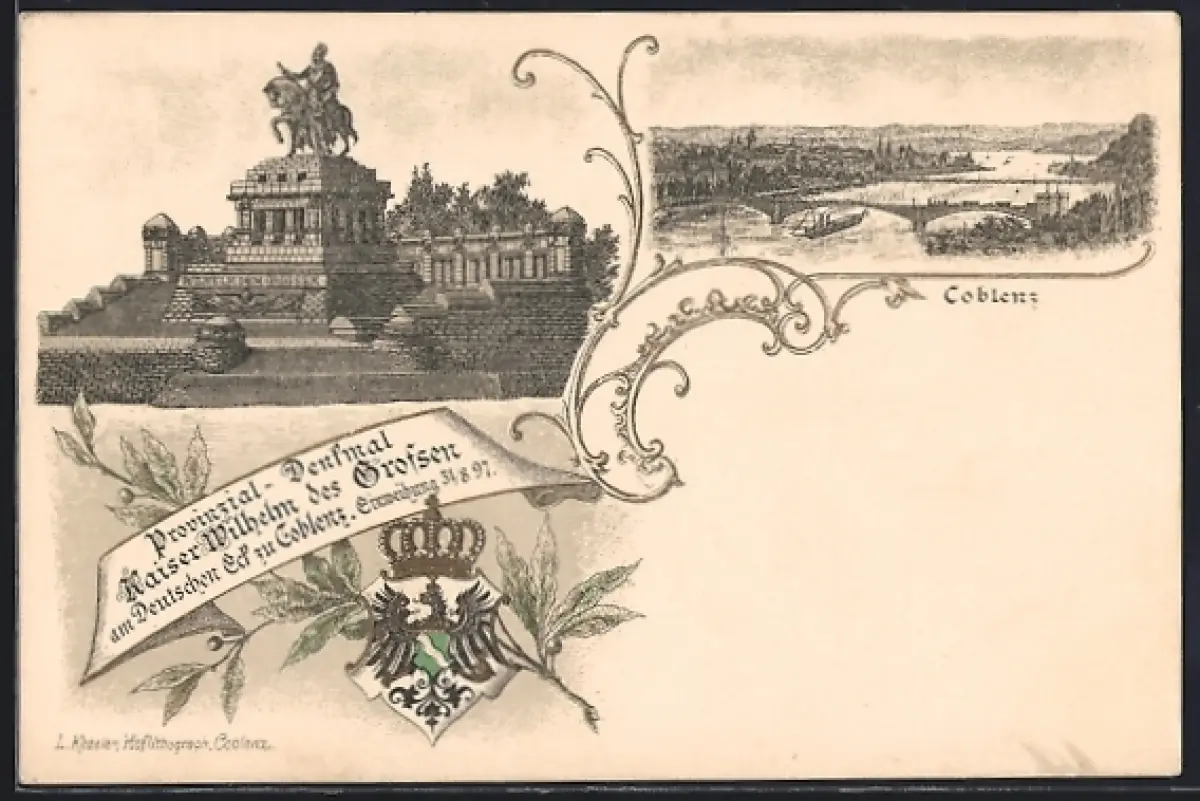 Lithographie Coblenz, Teilansicht mit Brücke, Provinzial-Denkmal Kaiser Wilhelm des Grossen, Einweihung 1897