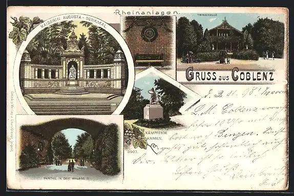 Lithographie Coblenz, Trinkhalle, Kaiserin Augusta-Denkmal, Rheinanlagen
