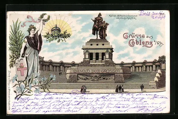 Lithographie Coblenz a. Rh., Kaiser Wilhelm I. Denkmal am deutschen Eck, Germania mit Lorbeerkranz