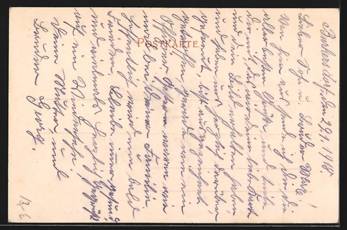 Personenbezogene Daten auf der Rückseite der Karte wurden durch blauen Textmarker unkenntlich gemacht. Die blauen Stellen sind auf die Vorderseite durchgeweicht und wirken sich negativ auf das Postkartenfoto aus
