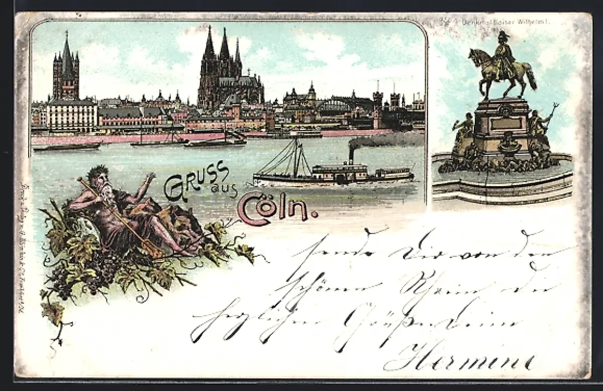 Lithographie Cöln, Ortspanorama mit Rheindampfer, Denkmal Kaiser Wilhelm I., Vater Rhein