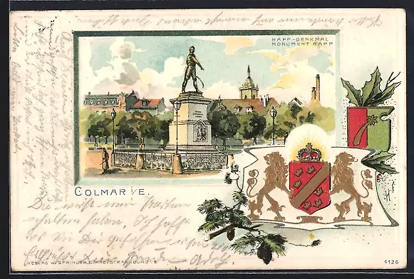 Lithographie Colmar, Rapp-Denkmal mit Passepartoutrahmen Wappen