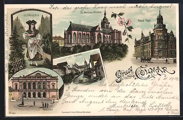 Lithographie Colmar, St. Martins-Kirche, Neue Post, Theater