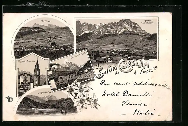 Lithographie Cortina d’Ampezzo, Ortsansicht mit Thurm und Misurina-See