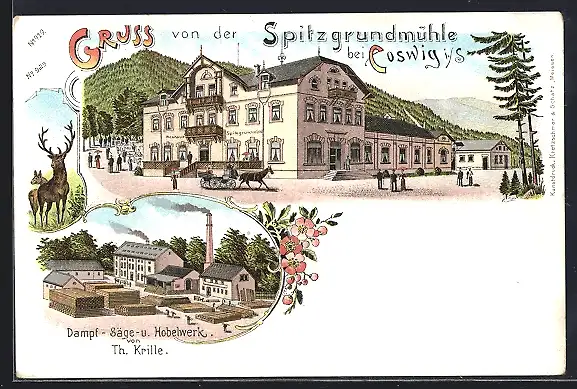 Lithographie Coswig i. S., Restaurant Spitzgrundmühle, Dampf-Säge- u. Hobelwerk von Th. Krille