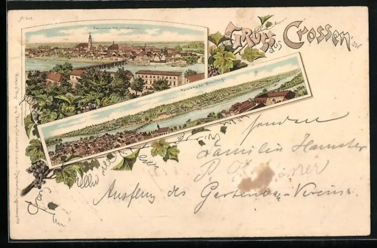 Lithographie Crossen, Panorama der Weinberge, Panorama der Stadtseite