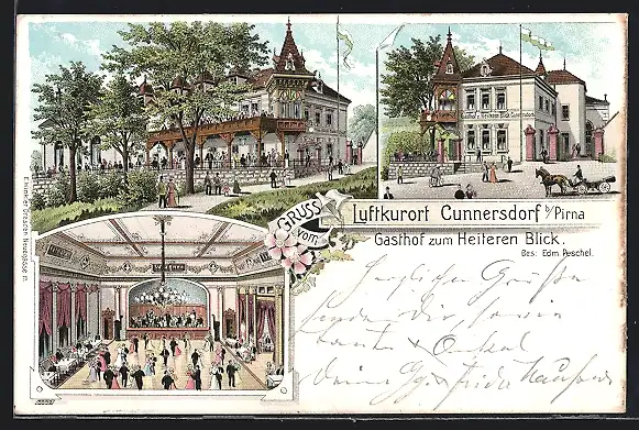 Lithographie Cunnersdorf b. Pirna, Gasthof zum Heiteren Blick, Bes. Edm. Peschel