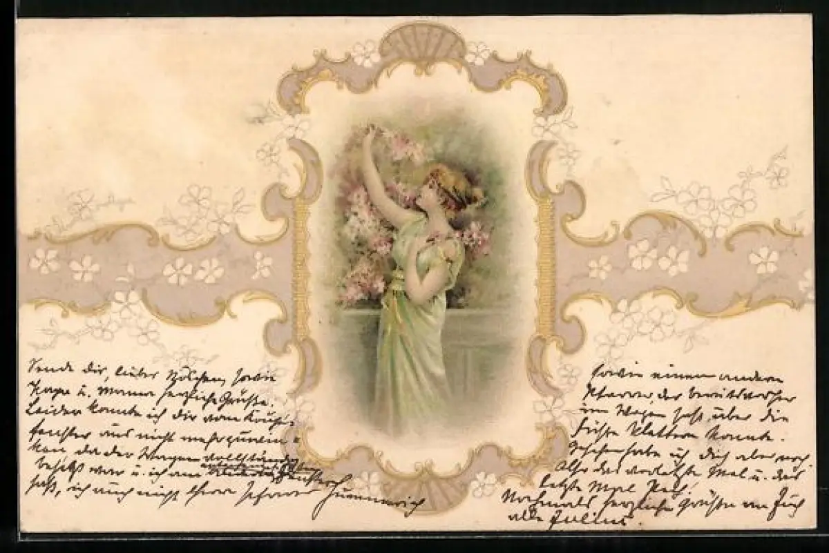 Lithographie Dame in grünem Kleid vor Blumen im Jugendstil