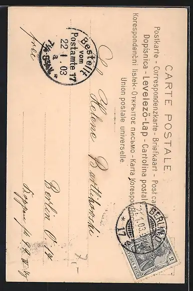 Personenbezogene Daten auf der Rückseite der Karte wurden durch blauen Textmarker unkenntlich gemacht. Die blauen Stellen sind auf die Vorderseite durchgeweicht und wirken sich negativ auf das Postkartenfoto aus