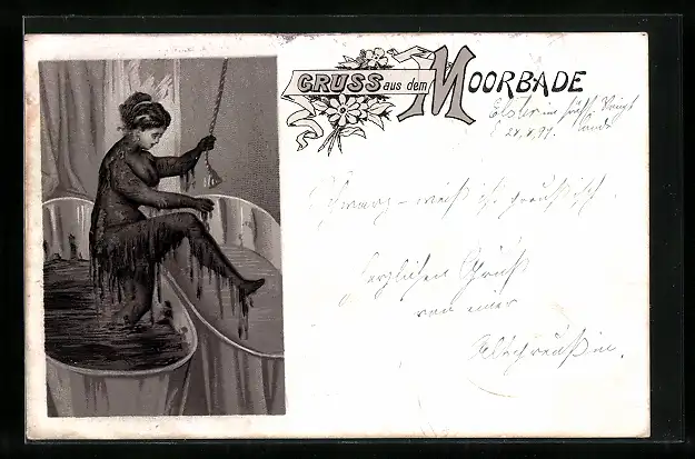 Lithographie Dame steigt vom Moorbad in das normale Bad hinüber