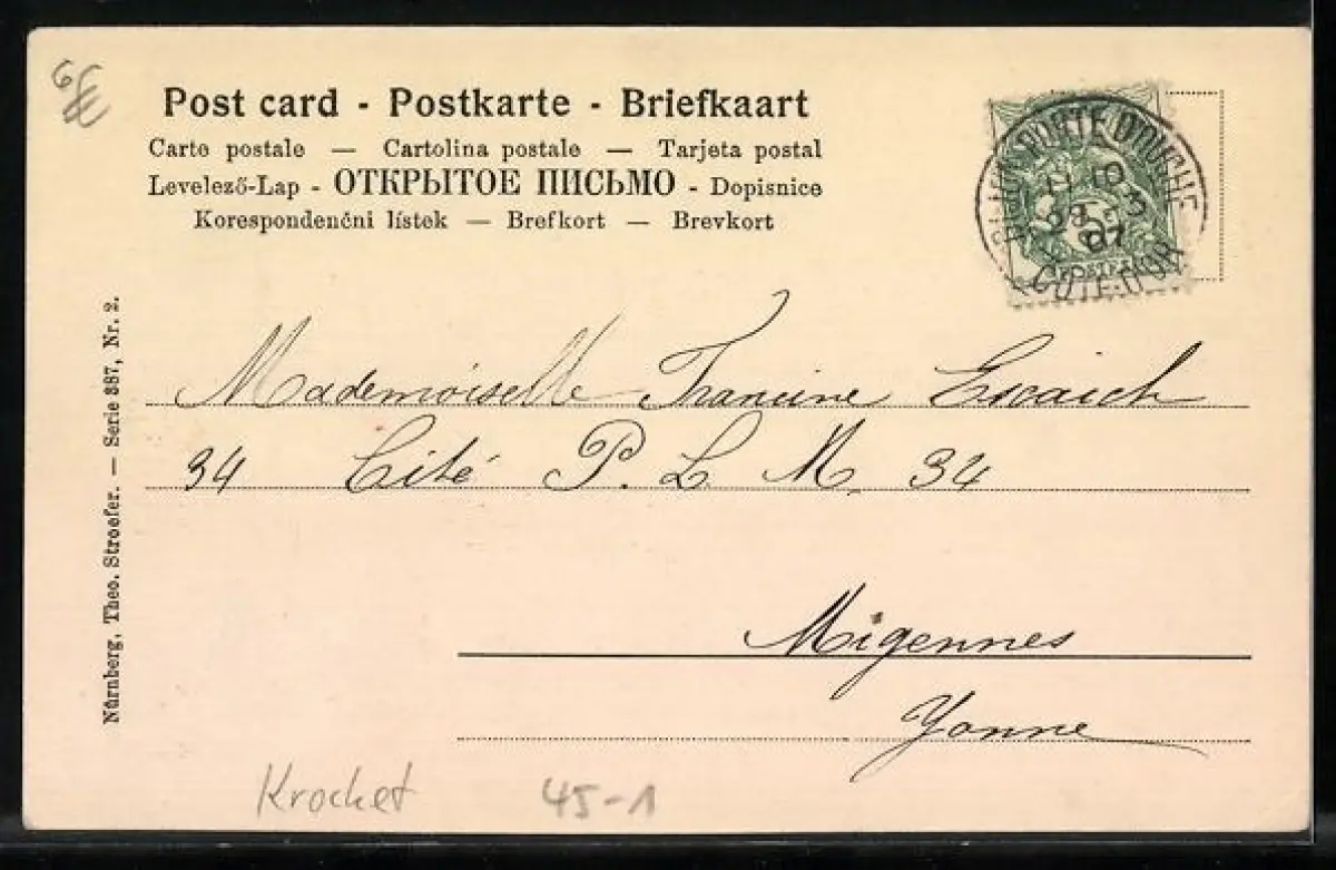 Personenbezogene Daten auf der Rückseite der Karte wurden durch blauen Textmarker unkenntlich gemacht. Die blauen Stellen sind auf die Vorderseite durchgeweicht und wirken sich negativ auf das Postkartenfoto aus