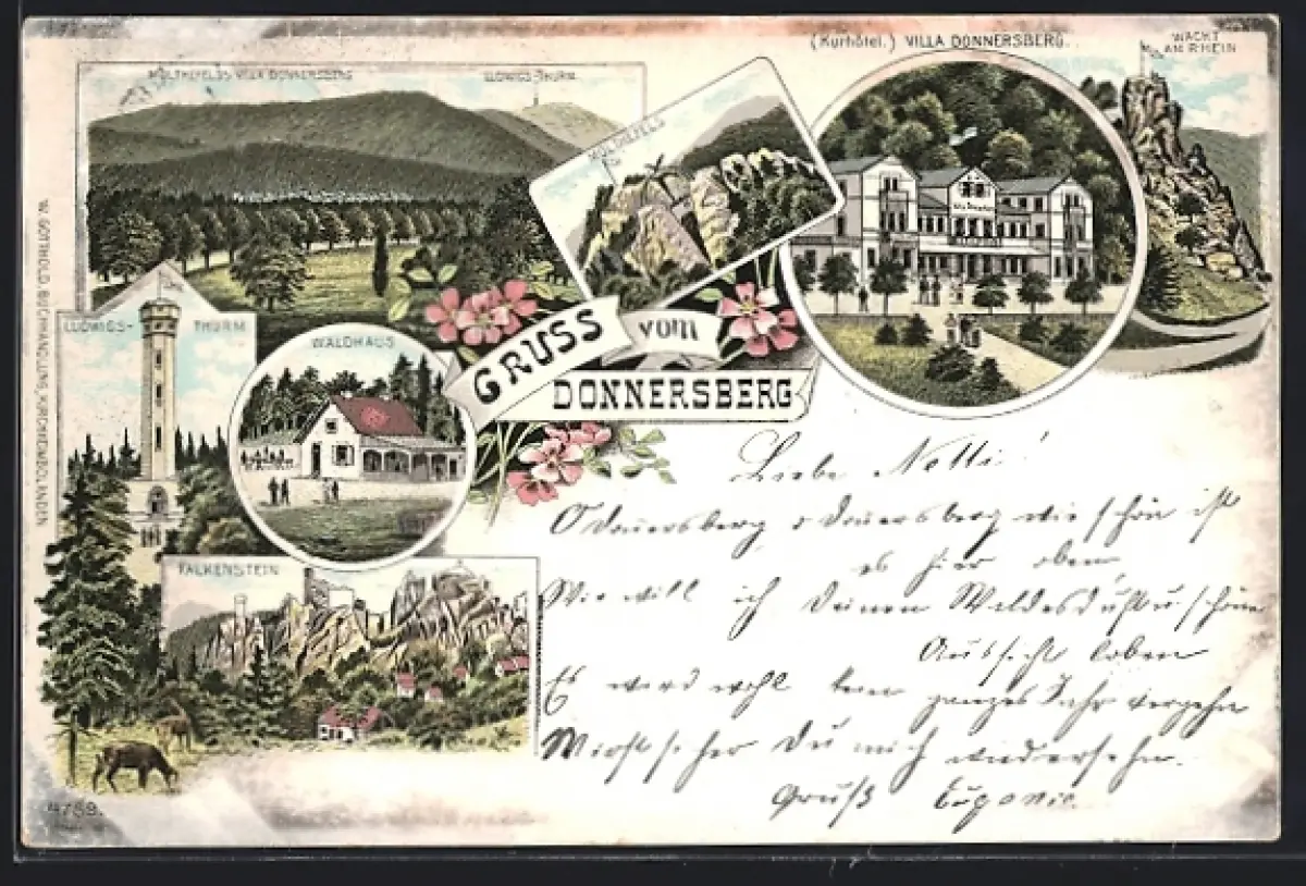 Lithographie Dannenfels am Donnersberg, Gasthaus Villa Donnersberg, Wacht am Rhein, Gasthof Waldhaus, Ludwigs-Thurm