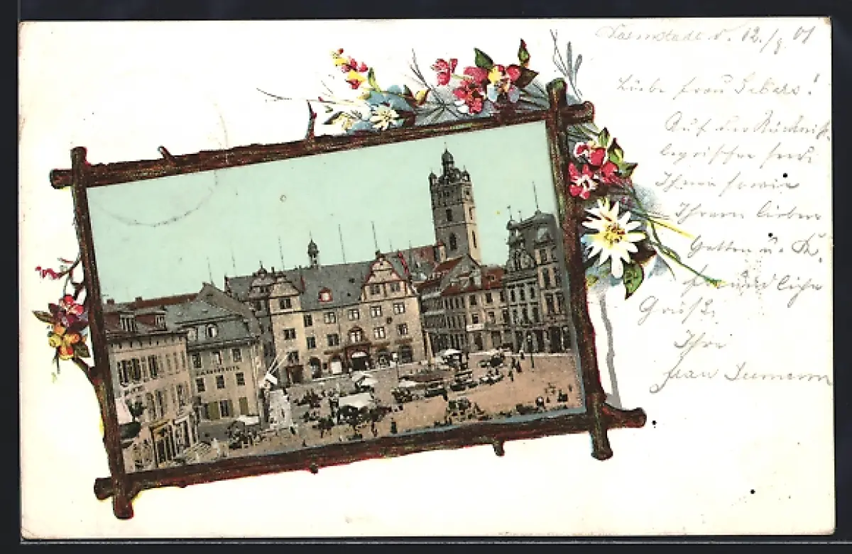 Lithographie Darmstadt /Gr.-H., Marktplatz mit Brunnen, Alpenblumen, Passepartout