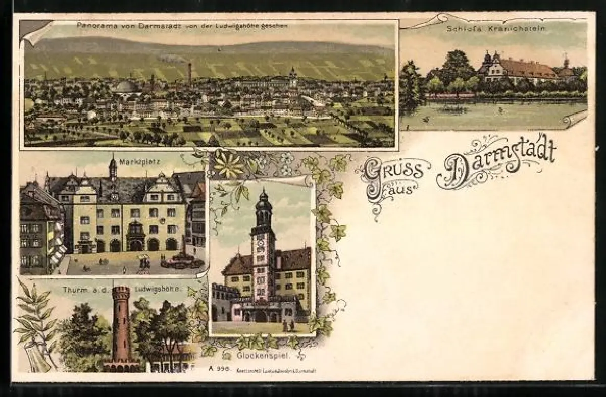 Lithographie Darmstadt, Panorama von der Ludwigshöhe, Marktplatz, Glockenspiel, Schloss Kranichstein