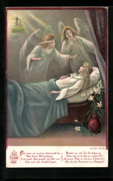 Lithographie Das Elterngrab, zwei Schutzengel bei einer Frau am Bett