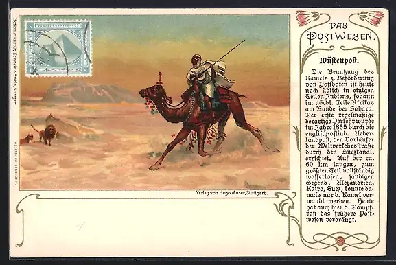 Lithographie Das Postwesen, Wüstenpost, Postbote reitet auf einem Kamel, Briefmarke
