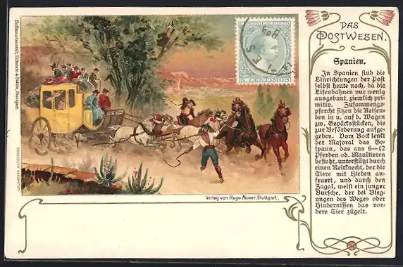 Lithographie Das Postwesen, spanische Postkutsche, Briefmarke