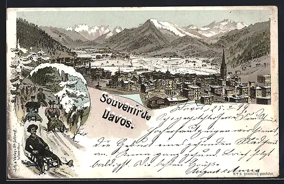 Lithographie Davos, Winterlich verschneite Totalansicht mit Bergpanorama, Schlittenfahrer, Um 1900