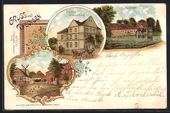 Lithographie Deensen, Gasthaus H. Kuhlmann, Rittergut, Schule