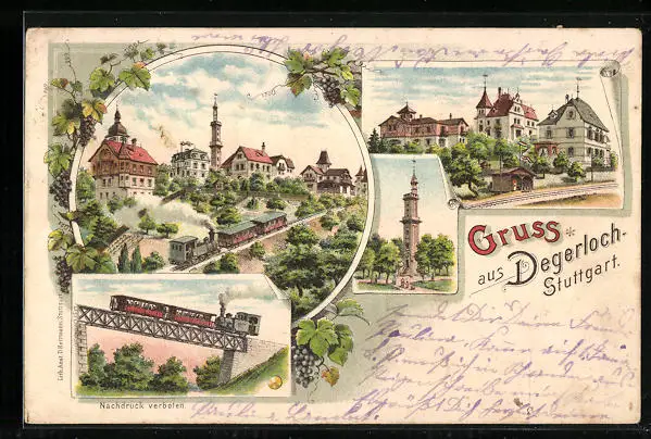 Lithographie Degerloch-Stuttgart, Ortspartie mit Denkmal und Eisenbahnbrücke