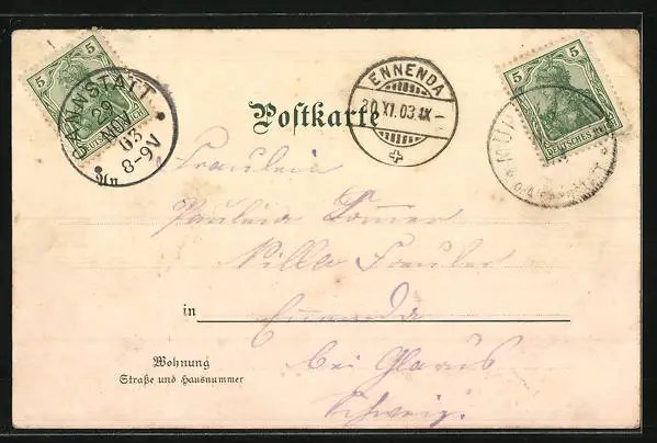 Personenbezogene Daten auf der Rückseite der Karte wurden durch blauen Textmarker unkenntlich gemacht. Die blauen Stellen sind auf die Vorderseite durchgeweicht und wirken sich negativ auf das Postkartenfoto aus