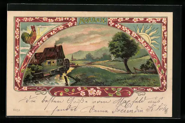 Lithographie Der Morgen Idyll an einer Wassermühle im Passepartout