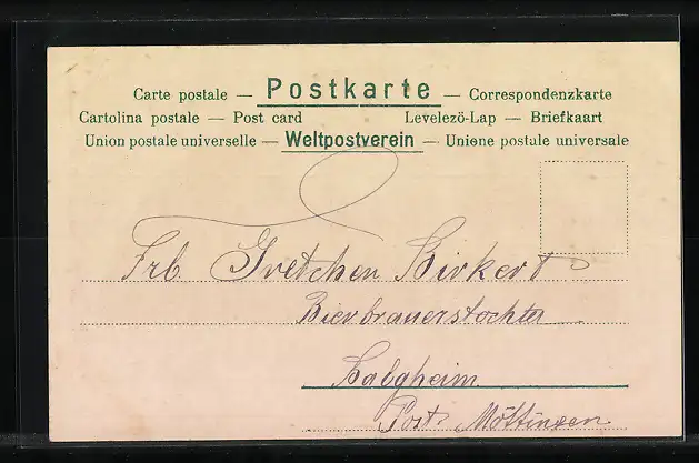 Personenbezogene Daten auf der Rückseite der Karte wurden durch blauen Textmarker unkenntlich gemacht. Die blauen Stellen sind auf die Vorderseite durchgeweicht und wirken sich negativ auf das Postkartenfoto aus