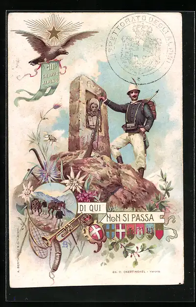 Lithographie Di Qui Non Si Passa, Infanterist auf einem Gipfel, III. Gruppo Alpino, Alpini