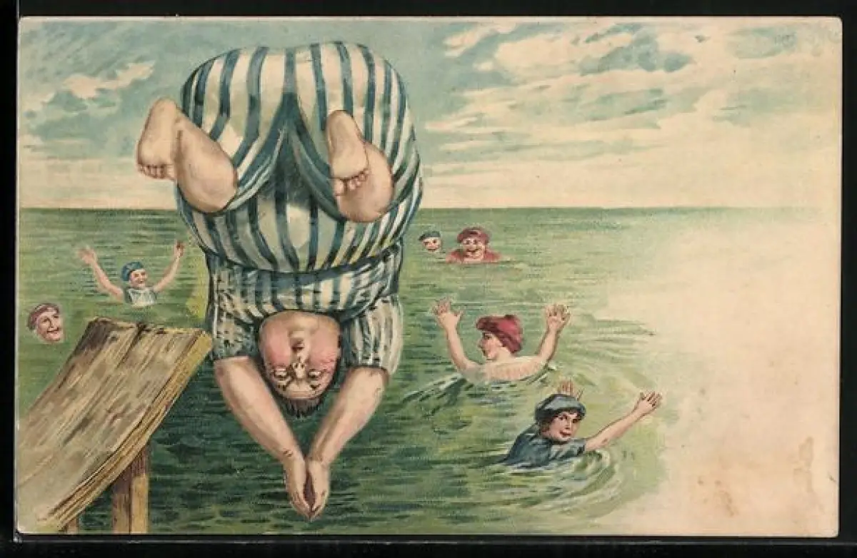 Lithographie Dicker im Badeanzug springt vom Sprungbrett ins Wasser am Meer